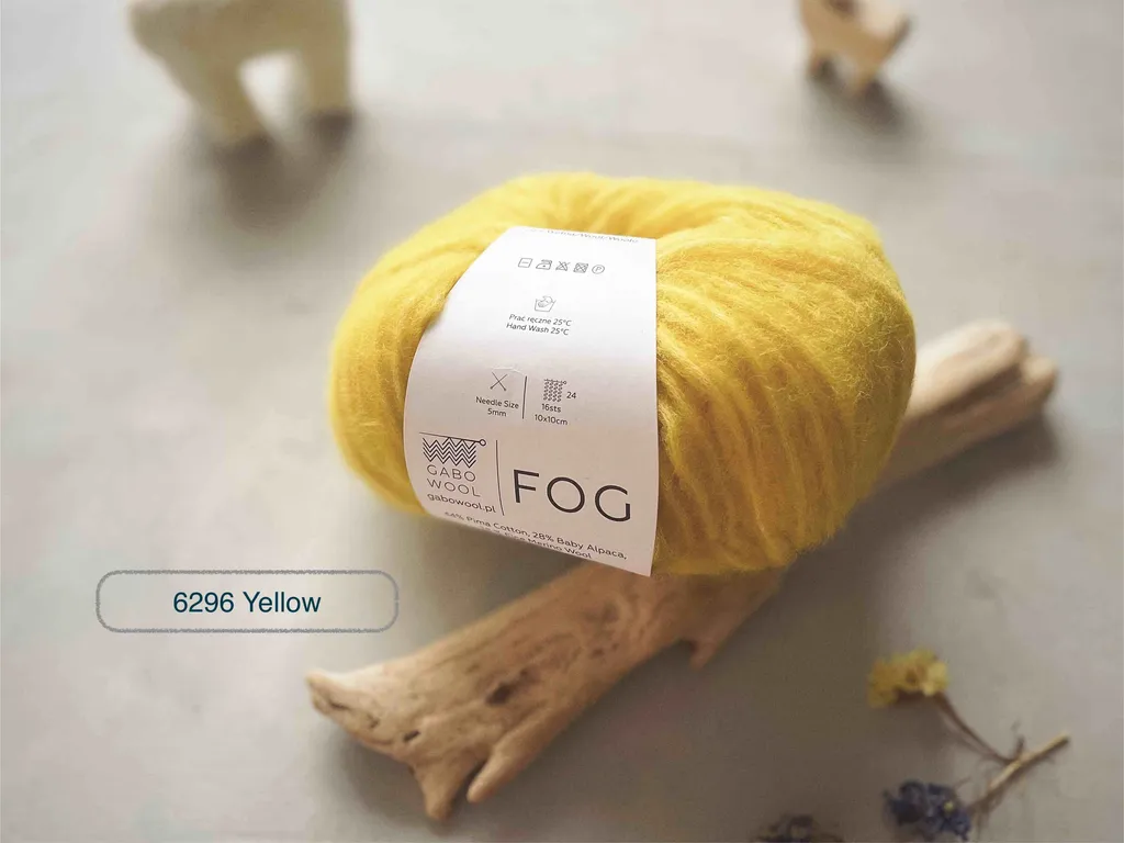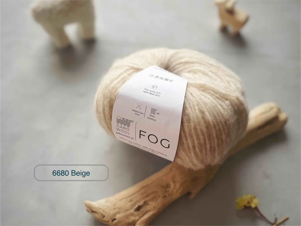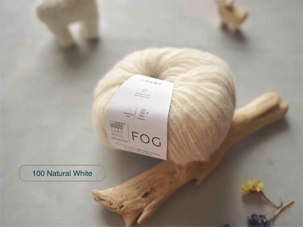 Fog・薄霧,細緻的幼羊駝+美麗諾混合後,以獨特的紡織技術將之吹入鎖鏈型皮馬棉的管芯中,這種合撚方式而成的線材,有如棉花糖般蓬鬆、柔軟,似薄霧般輕盈並充滿空氣感。